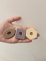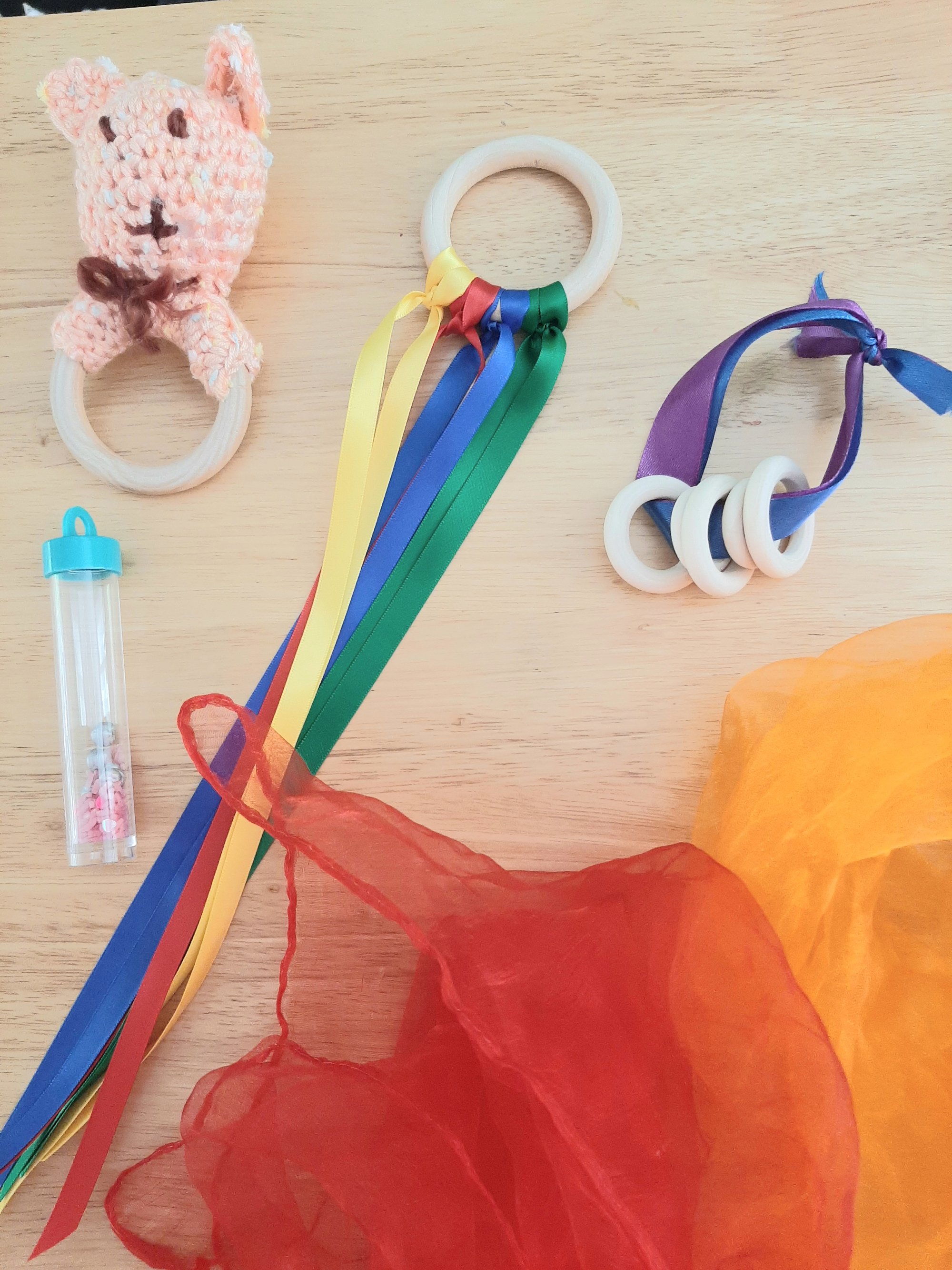 Kit includes a crocheted rattle, colourful ribbon, wooden ring toy, plastic shaker, small chew toy and two coloured scarves.