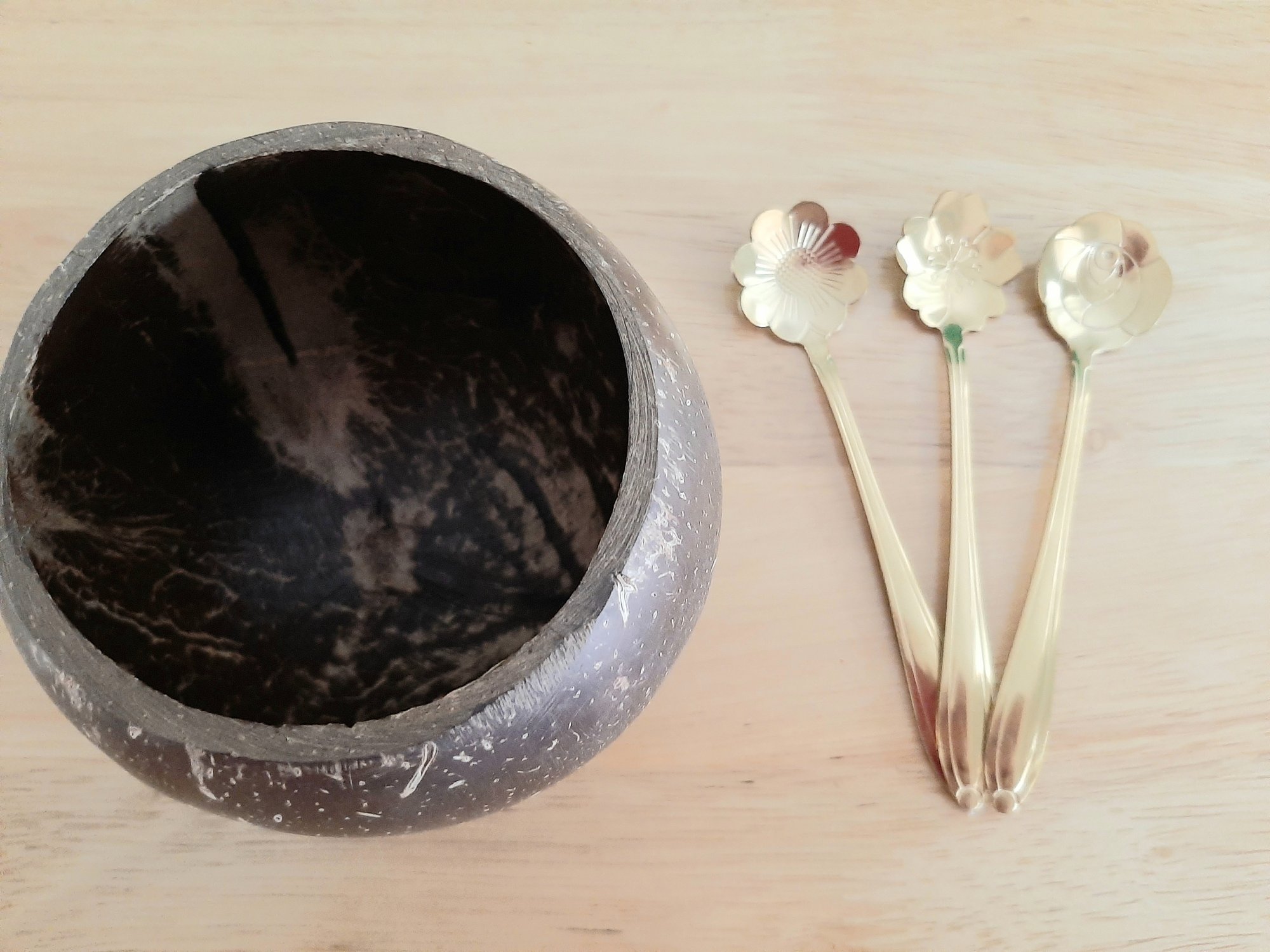 Cute little coconut bowl and three golden spoons. Perfect for sensory play.