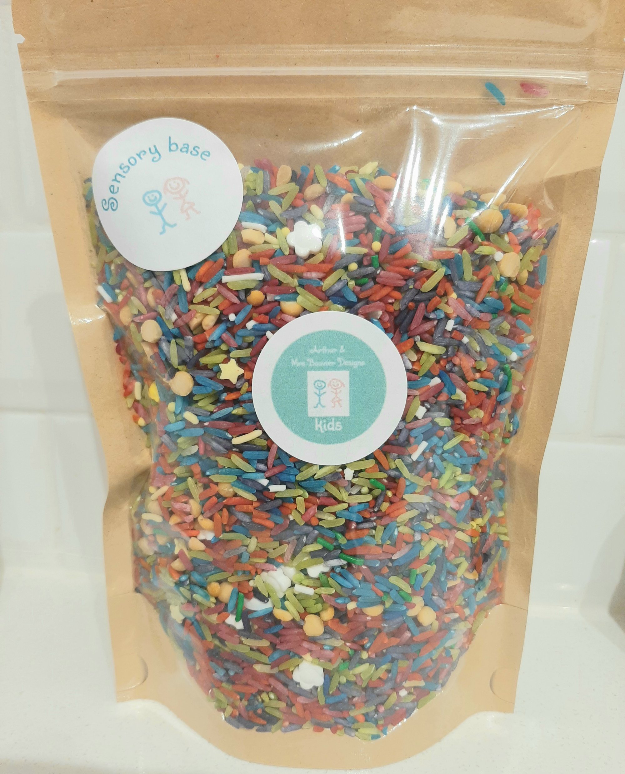 This is a gorgeous sensory kit perfect for home use for little hands. Featuring a 450gm bag of mixed coloured rice, Easter themed sprinkles and split peas.