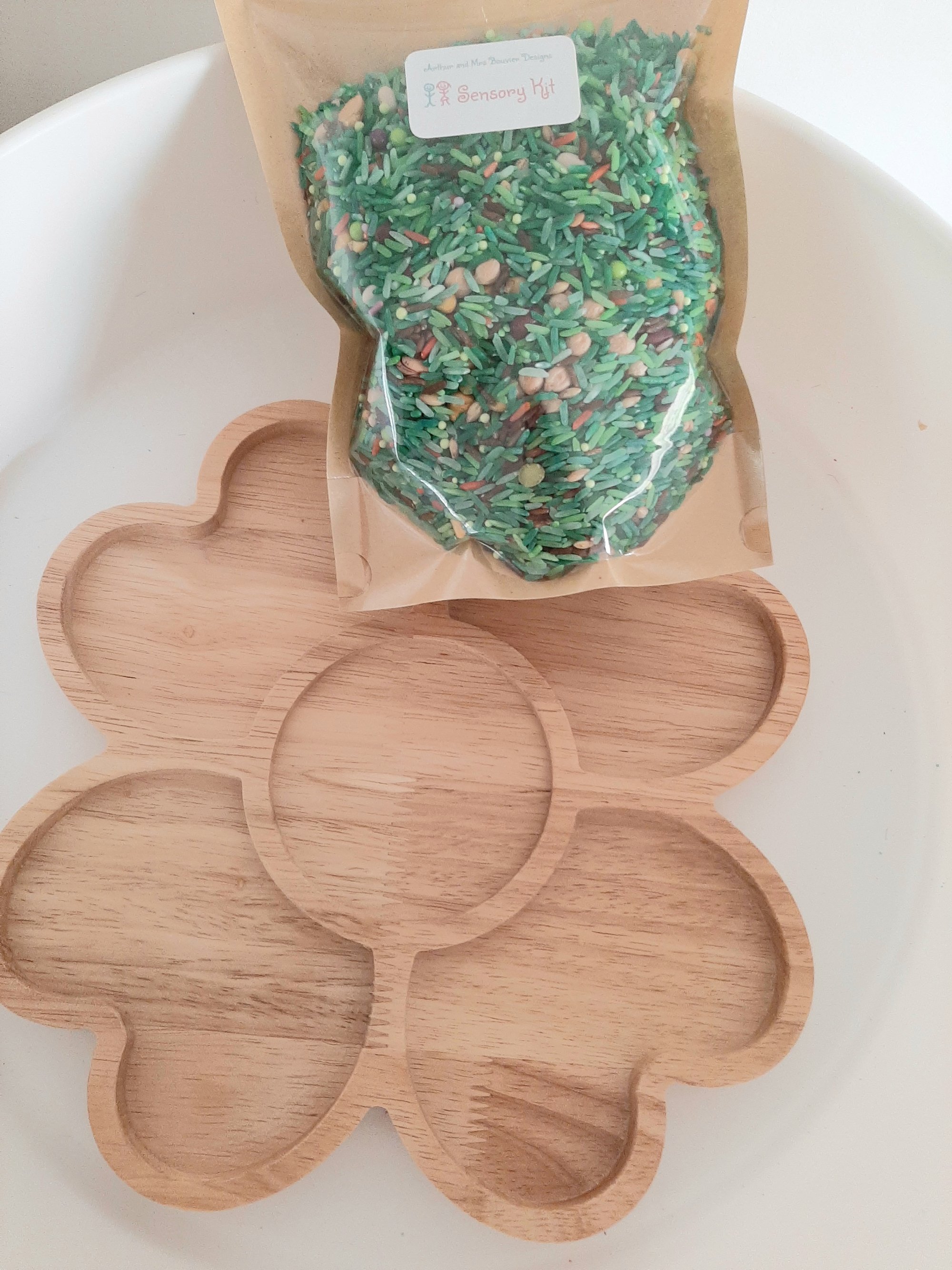 This is a gorgeous sensory kit perfect for home use for little hands. Featuring a 440gm bag of mixed coloured rice, chickpeas, seeds, lentils, split peas, sprinkles and a wooden flower tray.